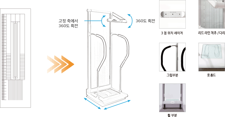 X-ray 소스를 통한 Spine, Pelvis, Leg의 Radiography를 획득시 신속하고 정확하며 만곡 및 수평정도의 Data를 쉽게 얻을 수